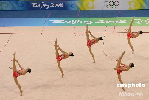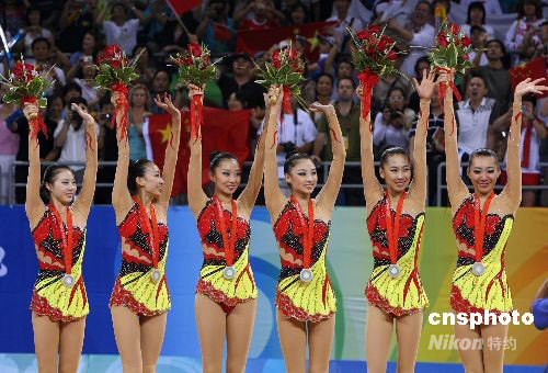 8月24日,中國藝術體操隊在北京奧運會藝術體操集體全能決賽中奪得銀牌,取得歷史性突破。中新社發 武仲林 攝