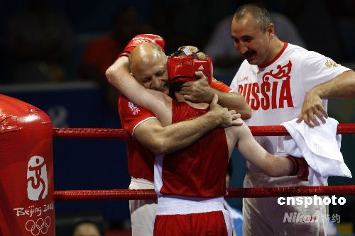 8月24日,在北京奧運(yùn)會拳擊比賽男子輕量級(60公斤級)決賽中,俄羅斯選手阿列克謝·季先科(紅)戰(zhàn)勝法國選手達(dá)烏達(dá)·索夫贏得冠軍。 中新社發(fā) 盛佳鵬 攝