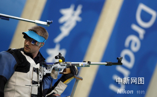 美國神槍手埃蒙斯因為自創的“歪把槍”法,最后一槍再次射偏“夢想”,繼雅典奧運會后,又再次拱手讓出只要正常發揮就“唾手可得”的男子50米步槍三種姿勢金牌。 中新社發 盛佳鵬 攝