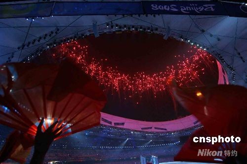 8月24日晚,第二十九屆夏季奧林匹克運動會在北京閉幕。盛大閉幕式開始,鳥巢焰火齊放,焰火圖案數字從29開始倒計時,最后一個數字“0”用拉手花束炸開一個滾動的、火紅的圓圈,圓圈周長長達600米,相當于圍繞鳥巢碗口“跑”一圈。中新社發 武仲林 攝