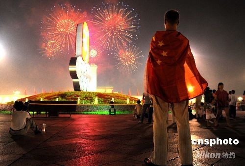 8月24日晚,一名外國人身披中國國旗在天安門廣場觀看慶祝奧運會閉幕而燃放的煙花。中新社發(fā) 廖攀 攝