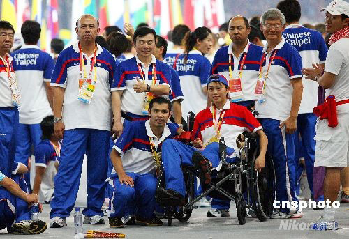 8月24日晚,北京奧運會圓滿閉幕。中華臺北代表團70多名隊員參加閉幕典禮,備受關注的跆拳道好手蘇麗文(前排右)坐著輪椅,由隊友推進場,成為中華臺北隊最受歡迎的選手。 中新社發 CNAsports 攝