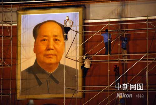 8月25日晚,為迎接殘奧會,工人們正對天安門城樓進行重新裝修。據工作人員介紹,目前天安門城樓上搭建的腳手架主要是為了進行城樓外墻的粉刷。(楊慧峰/攝影)