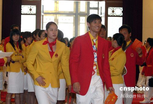 8月26日,2008年北京奧運會中國體育代表團總結大會在北京人民大會堂金色大廳舉行。仲滿、劉子歌出席北京奧運會中國體育代表團總結大會。中新社發 廖文靜 攝