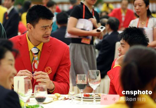 姚明、林丹參加北京奧運中國體育代表團慶祝宴會。中新社發 廖文靜 攝