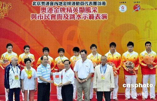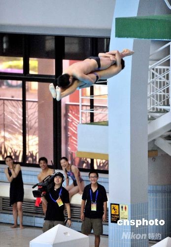 跳水運動員在荃灣城門谷游泳池作跳水示范表演。香港特區行政長官曾蔭權同太太亦到場觀賞跳水表演。中新社發 譚達明 攝