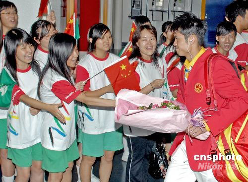 八月三十一日傍晚,北京奧運內地金牌運動員代表團一行九十三人抵達澳門,開始為期三天的訪問。中新社發 澳門新聞局 攝