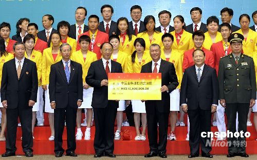 圖為澳門特區行政長官何厚鏵向代表團頒發獎金。