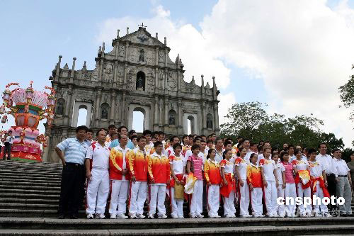 九月一日上午,在澳門訪問的北京奧運內地金牌運動員代表團一行來到著名景點大三巴游覽,興高采烈地合影。