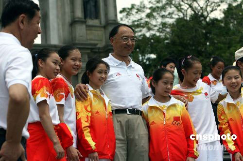 九月一日上午,北京奧運(yùn)內(nèi)地金牌運(yùn)動(dòng)員代表團(tuán)在澳門(mén)展開(kāi)第二日訪問(wèn)行程,代表團(tuán)團(tuán)長(zhǎng)劉鵬與奧運(yùn)女子體操團(tuán)體金牌選手們?cè)诎拈T(mén)著名景點(diǎn)大三巴前留影。中新社發(fā) 洪少葵 攝