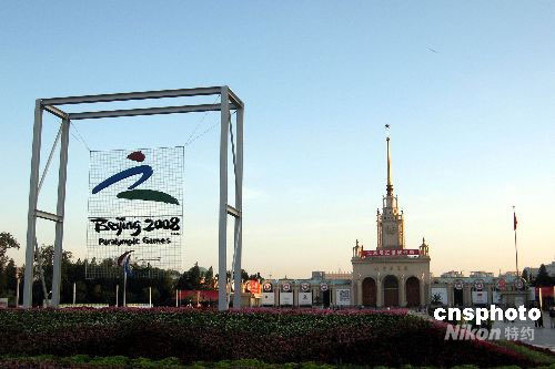 2008年9月2日清晨,北京展覽館前廣場(chǎng)上的殘奧主題花壇已經(jīng)基本布置完畢,迎接即將召開的第13屆殘疾人奧運(yùn)會(huì)。中新社發(fā) 莊浦明 攝