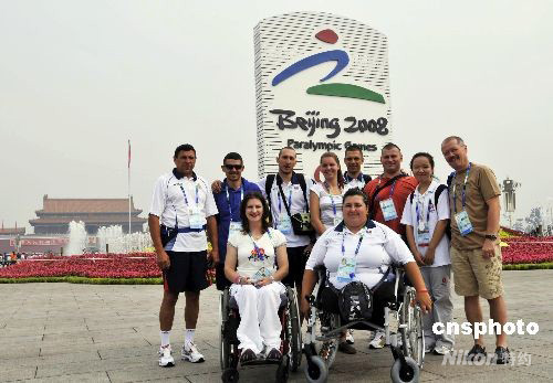 9月3日,羅馬尼亞殘奧會運動員在志愿者的陪同下來到天安門廣場參觀游覽,體驗北京殘奧會氣氛和熱情友好的北京,并在殘奧會會徽“天地人”前合影留念。 中新社發 王宇婷 攝