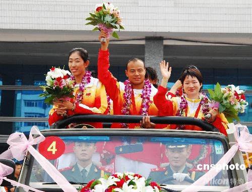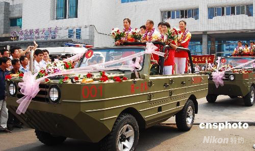 圖為當(dāng)?shù)匚渚筷?duì)用水陸兩棲車迎載北京奧運(yùn)皮劃艇冠軍楊文軍(前中)、跆拳道冠軍吳靜鈺(前右)、女子賽艇四人雙槳冠軍金紫薇(前左)等人。