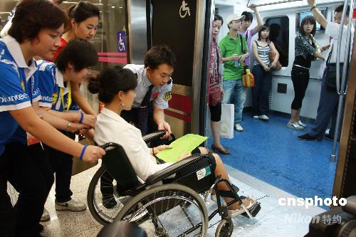 9月3日,在北京主要交通路口、地鐵站、郵局、旅游區和奧賽場館附近,隨處可見面帶笑容的志愿者們。這一天,是北京殘奧會志愿服務的行動日。北京燈市口地鐵站點志愿者正在進行殘奧會前的最后演練。殘奧會期間,乘坐輪椅的殘障人士如需坐地鐵,可提前打電話預約,到達地鐵站后有志愿者和工作人員提供一對一式服務。中新社發 鄭雄增 攝