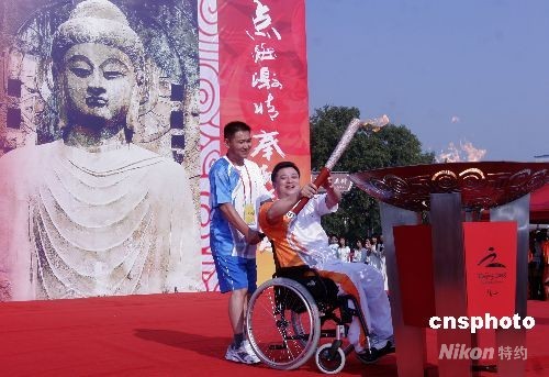 9月4日, 火炬手在最具洛陽特色的城市名片——世界文化遺產龍門石窟景區內傳遞殘奧會火炬。當日,北京2008殘奧會火炬在千年帝都、牡丹花城洛陽傳遞,這是火炬進京前最后一站,共有65名火炬手參加。中新社發 張曉理 攝
