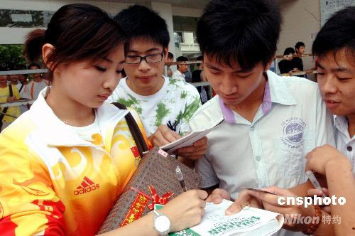 圖為被譽(yù)為中國最美奧運(yùn)冠軍的何雯娜為眾多大學(xué)生“粉絲”簽名。 中新社發(fā) 劉可耕 攝