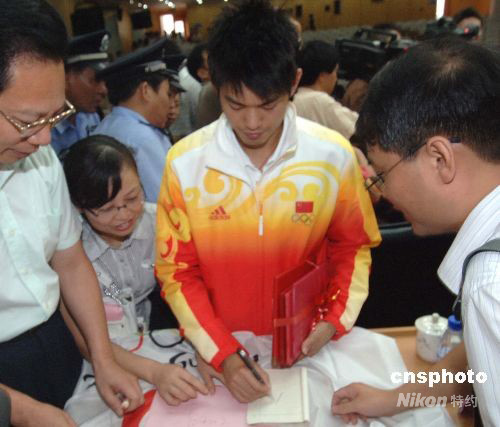 圖為奧運會羽毛球男單冠軍林丹為家鄉球迷簽名。 中新社發 劉可耕 攝
