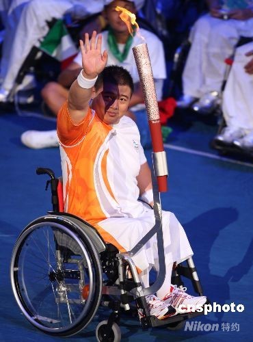 圖為殘疾運(yùn)動員傳遞火炬。中新社發(fā) 宋吉河 攝