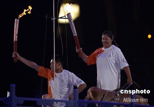 圖為平亞麗在導(dǎo)盲犬的幫助下點燃主火炬點燃者侯斌手上的火炬。最后一棒火炬手侯斌(左)是三屆殘奧會的冠軍得主。中新社發(fā) 杜洋 攝