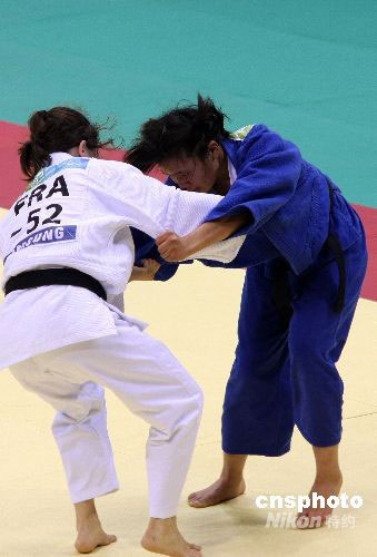 9月7日,在北京殘奧會盲人柔道女子52公斤級的決賽中,中國選手崔娜(藍衣)擊敗法國選手桑德里娜·奧里埃·馬蒂內,獲得金牌。中新社發 王韶驊 攝