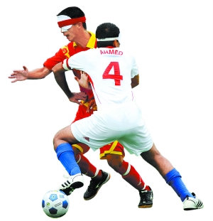 在昨天5人制(盲人)足球比賽的現場,中國隊11號前鋒王亞鋒讓人眼前一亮,他不僅獨中兩元,而且全場射門高達15次,超過全隊總射門次數的一半。記者坐在看臺上不時聽到周圍的觀眾如此評價王亞鋒:“小伙子腳下技術活兒真好,估計一些健全人足球愛好者的功底都比不上他。”