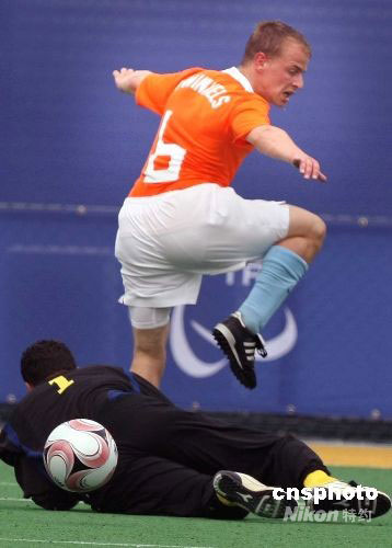 北京殘奧會七人制(男子)足球比賽9月8日在北京奧林匹克公園內的橄欖球場開賽,在一場焦點比賽中,實力強大的巴西隊與荷蘭隊遭遇,最后巴西隊以1比0擊敗荷蘭隊。圖為巴西隊11號若澤·吉馬良斯突破防線后被人高馬大的荷蘭隊5號后衛喬伊·門斯放倒。殘奧會七人制(男子)足球比賽在橄欖球賽場舉行,全場共60分鐘,隊員為腦癱患者。中新社發 任晨鳴 攝