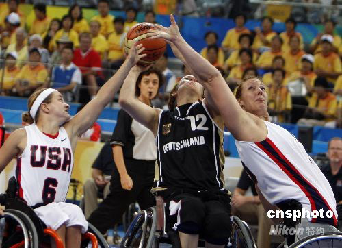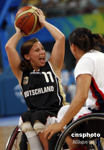 9月8日,北京殘奧會女子輪椅籃球A組預賽中,德國隊(深色)以38比42的比分敗在美國隊手下。 中新社發 杜洋 攝