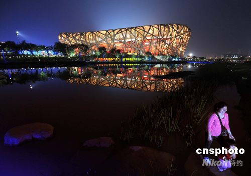 9月8日,在國家體育場“鳥巢”外,觀眾紛紛在美麗的夜景前留影。中新社發 廖攀 攝