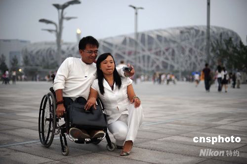 9月8日,北京正在舉辦殘奧會的國家體育場外,一位殘疾男青年和伴侶溫情留影。中新社發 廖攀 攝