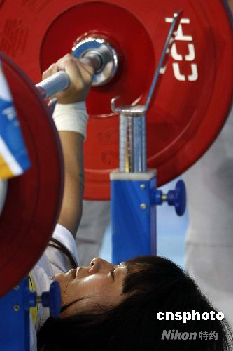9月9日,北京殘奧會舉重比賽在北京航空航天大學體育館展開首日的爭奪,在女子40公斤級的比賽中,烏克蘭選手利季婭-索洛維約娃以100公斤的成績奪得金牌,此外,她還以105.5公斤的成績創造了新的殘奧會紀錄。中國選手崔哲奪得銀牌,成績為95公斤,墨西哥選手勞拉-塞雷羅獲得一枚銅牌,成績為92.5公斤。 中新社發 盛佳鵬 攝