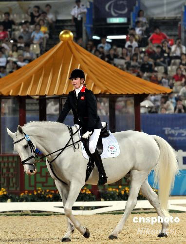 九月十一日晚,來自英國的選手索菲-克里斯琴森在香港殘奧馬術盛裝舞步“個人自選動作科目-級別Ia”上獲得金牌。圖為索菲-克里斯琴森策騎馬匹“朗布魯斯科三世”在比賽中。 中新社發 鄧慶樂 攝