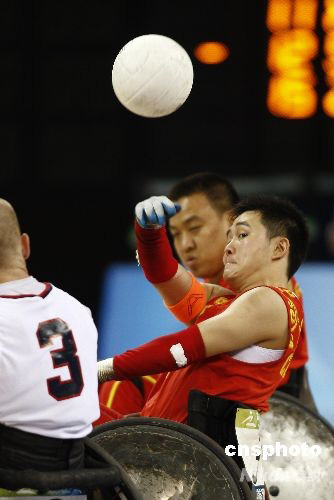 9月12日,北京殘奧會輪椅橄欖球展開首日比賽,東道主中國隊以30比65的比分不敵美國隊。 中新社發 杜洋 攝
