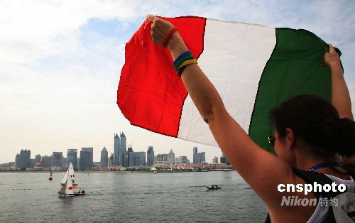 9月11日下午,北京殘奧會帆船比賽進行第三個比賽日的比賽,當參賽選手起航前往賽場時,各國觀眾拿著標語為選手加油。中新社發 王輝 攝