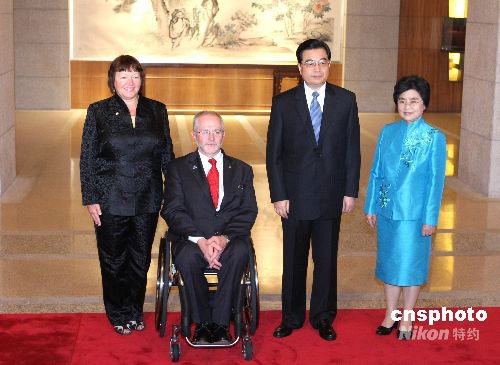 9月17日,中國國家主席胡錦濤與夫人劉永清在北京釣魚臺國賓館芳菲苑舉行宴會歡迎出席北京殘奧會閉幕式的國際貴賓。圖為胡錦濤與夫人迎接殘奧委會主席克雷文夫婦。中新社發 廖文靜 攝