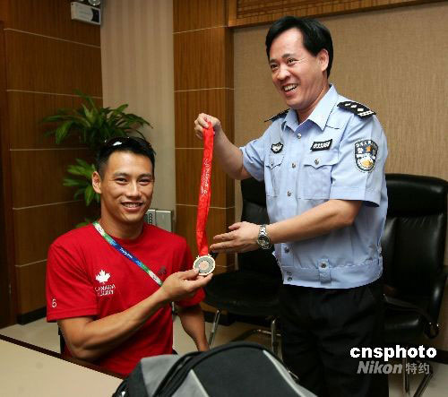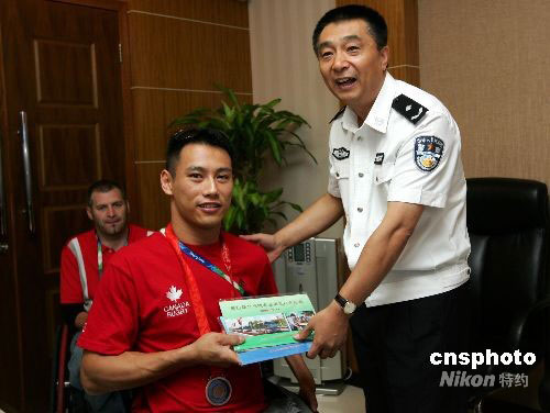 9月18日,一枚失而復得的北京殘奧會獎牌由北京公交民警交還到了加拿大運動員杰瑞德手中。9月17日晚,加拿大運動員杰瑞德在乘坐出租車時不慎將自己的雙肩包遺忘在車上,公交民警接警后,在線索非常有限的條件下,只用了四個小時,就將背包找回,里面有一枚寶貴的殘奧會橄欖球銅牌。中新社發 富田 攝