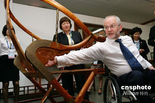 9月18日,酷愛中國傳統文化的國際殘奧委會主席菲利普·克雷文偕夫人到中國紫檀博物館參觀,仔細觀看珍貴的黃花梨木交椅,并向全國政協委員、中國紫檀博物館館長陳麗華女士致謝。北京殘奧會期間,中國紫檀博物館提供紫檀家具,在克雷文夫婦下榻的港澳中心專門布置了充滿濃郁中國傳統文化特色的會客廳、辦公室。中新社發 毛建軍 攝