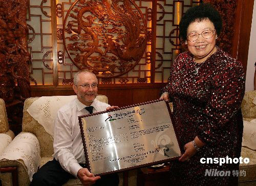 菲利普·克雷文代表國際殘奧委會向陳麗華館長贈送感謝狀。中新社發(fā) 毛建軍 攝