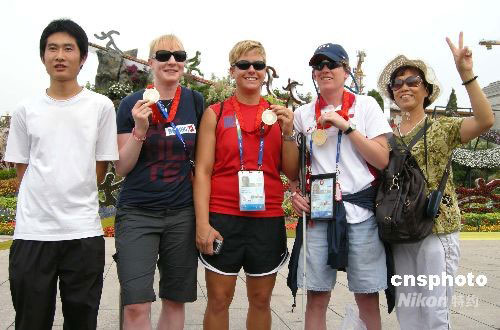 2008年9月18日,幾位獲得北京殘奧會金牌的美國盲人運動員來到北京天安門廣場游覽,吸引了眾多游客的目光,游人們竟相與他們合影留念。中新社發 玉龍 攝