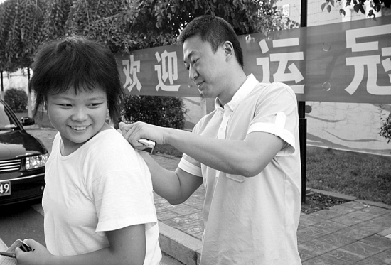 簽名、合影,幾乎成了馬琳昨天重復最多的兩個動作。馬琳則一概表現出巨大的耐心,全力配合。一位胖胖的小女孩一直跟隨了馬琳走出幾十米后還沒簽上名。“我不敢!”小女孩說。看著馬琳走到訓練館門前,即將上車,小女孩終于鼓起勇氣沖上前去要求馬琳簽名。“給我簽在背上好嗎?”小女孩要求。馬琳于是轉到女孩身后,在女孩的衣服上鄭重簽下了自己的名字。