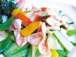 中國民間認為玫瑰有“行氣解郁,滋陰清熱”的功效。粉紅玫瑰是浪漫的象征,它嬌俏的外形和顏色容易讓人聯想到快樂、優雅等詞匯。用粉紅玫瑰來做菜很討女生歡心,比如這道“北極深海玫瑰”就充滿浪漫的異國情懷。它里面還有水東芥菜、芥藍片、北極貝、雞腿肉等,北極貝爽口,玫瑰花瓣清香,各種材料搭配在一起清淡而可口。