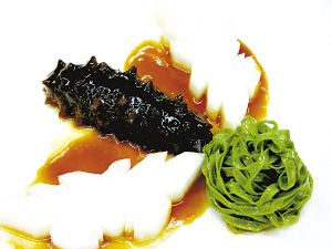 其實就是荷汁面拌遼參。這道菜的構思比較特別,它是用新鮮荷汁來打面條,打出來的面條質地細膩無瑕,滲透著荷葉獨有的清香、甘甜的氣息。蓮葉還有和血、清暑、去濕的功效。遼參味道爽脆、比較新鮮,也很適合夏天。