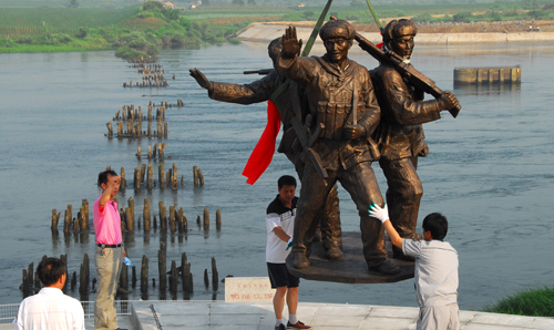 為紀念抗美援朝戰爭60周年,由丹東市委宣傳部組織實施的兩組主題分別為《送別親人》和《告別祖國》的雕塑昨日(5日)下午運抵抗美援朝戰爭遺址——鴨綠江燕窩鐵路橋和鴨綠江沙河口鐵路橋。