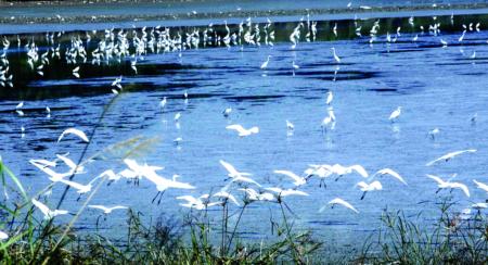 白鷺點點,或在空中低旋,或立于魚塘中覓食,足有千余只。11月25日,在福州大學城福州大學新校區附近的一片魚塘里,千只白鷺大團聚,蔚為壯觀,就連過往的車輛都停車觀看。