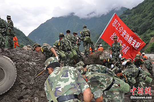 圖:武警官兵在汶川銀杏鄉清淤恢復美好家園