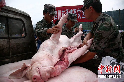 阿壩州為奮戰在映秀泥石流災區的武警官兵送豬肉