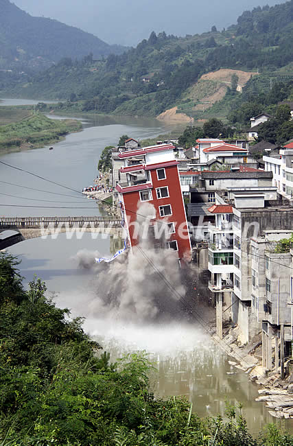 在限期內,房主仍未自行拆除。7月24日,縣防汛抗旱指揮部委托湖北宜昌一家爆破公司承擔該違法建筑的爆破拆除任務。