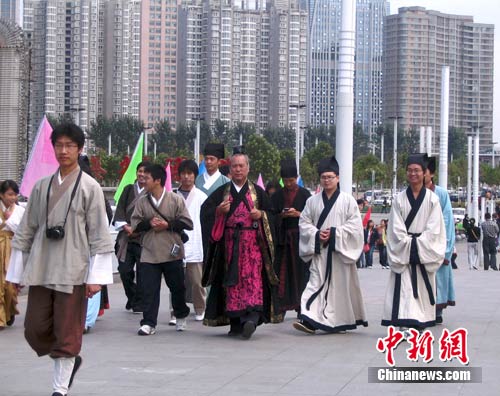 白楊是這群人里為數(shù)不多的女性。她告訴記者,自己一直就很迷戀中國古代的服飾,這次穿的衣服是在網(wǎng)上訂做的,總共花費(fèi)不足二百元,現(xiàn)在能有機(jī)會(huì)穿出來,真的很高興。今天在路上,還有人問白楊是不是韓國人,“呵呵,以后每逢傳統(tǒng)節(jié)日都會(huì)這樣穿著,我要讓大家知道這叫漢服!”