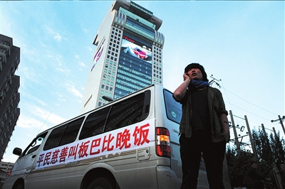 “平民慈善叫板巴比晚飯。”昨天下午5點(diǎn),朝陽區(qū)北四環(huán)中路盤古大觀酒店樓下,一輛白色面包車身上的挑釁口號(hào)引得周圍市民駐足觀看。