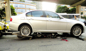 據(jù)目擊者介紹,事發(fā)時(shí),這輛牌號(hào)為滬H的銀灰色寶馬轎車沿曲陽(yáng)路由北向南行駛,至東體育會(huì)路附近時(shí)與一輛電瓶車發(fā)生碰撞。電瓶車被撞倒,騎車的中年男子當(dāng)場(chǎng)倒地。30多歲的女司機(jī)在慌亂中或許錯(cuò)將油門當(dāng)成了剎車,轎車猛沖向前,將電瓶車一路往前推行數(shù)米遠(yuǎn)。最終,男子連人帶車被卷入轎車底盤,轎車則卡在電瓶車上,后輪騰空,車身動(dòng)彈不得。
