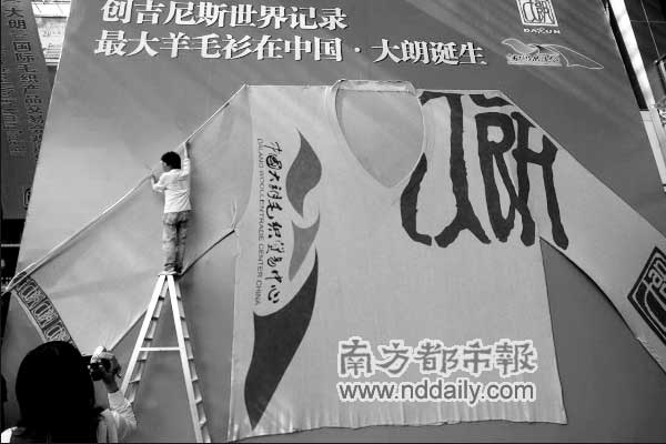 昨日在第六屆中國大朗國際毛織產品交易會開幕式上,一件身長5米,胸圍8.6米,袖長4.3米的大毛衫掛在交易會主會場入口處,經英國吉尼斯總部派出的驗證官、省質量監督局毛織品檢測站,以及常平公證處的工作人員現場認證,該毛衫目前為世界上最大的毛衫。目前大朗毛織貿易中心已經正式向世界吉尼斯總部提出“世界最大毛衫”的相關申請。
